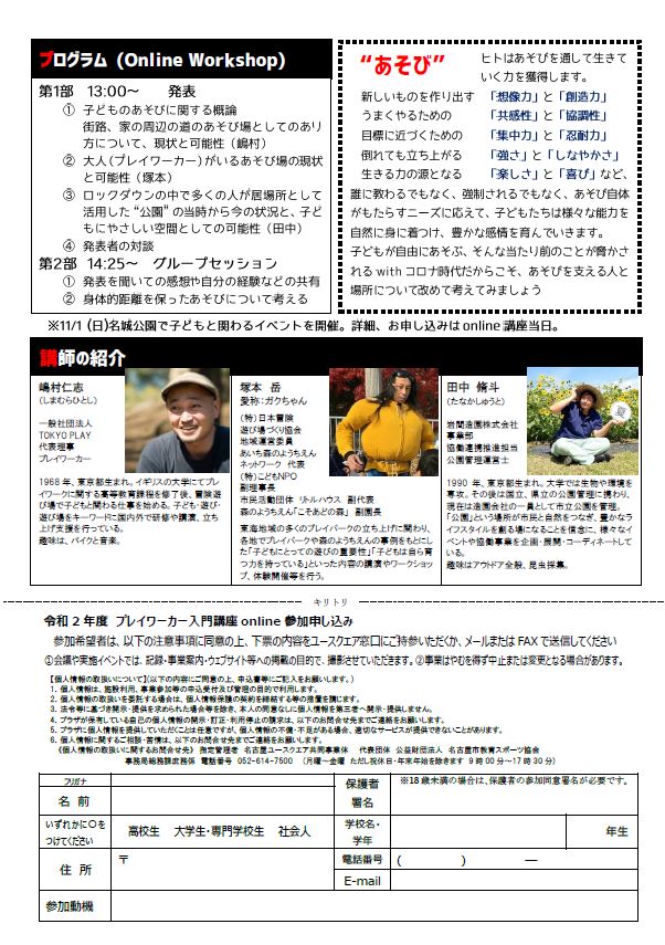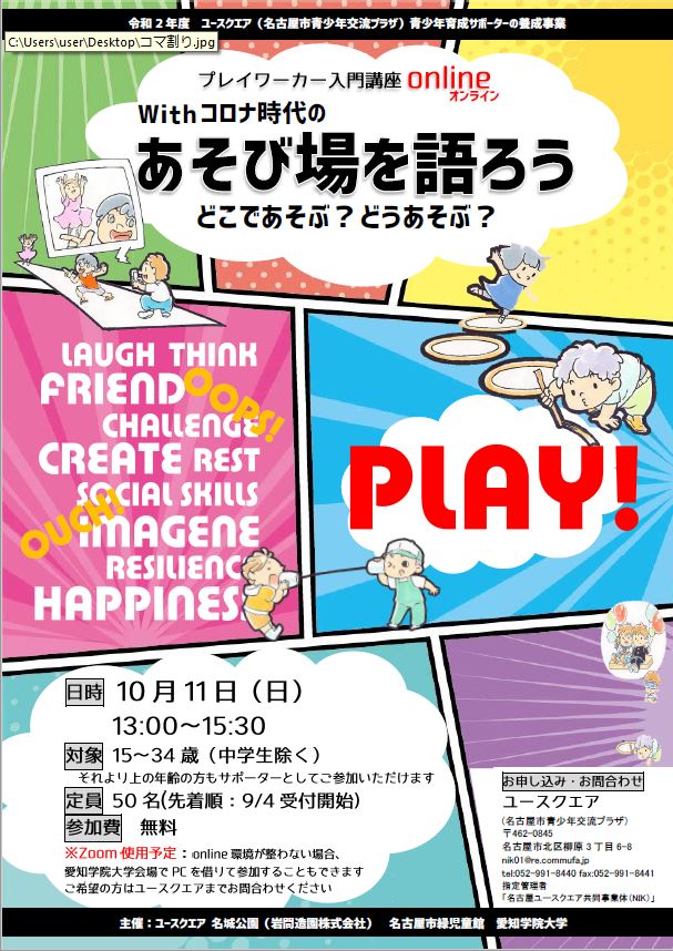 | 10月11日(日)12:00―15:30 | プレワーカー入門講座online withコロナ時代のあそび場を語ろう! | オンライン(Zoom) |